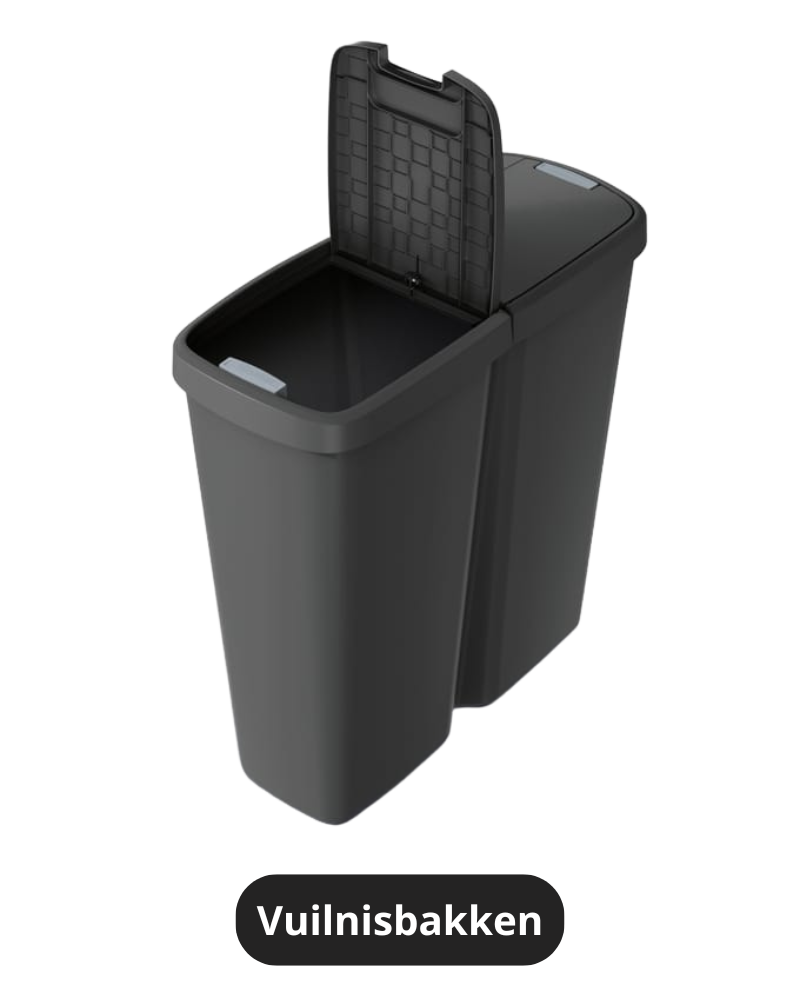• De grootte van de prullenbak is afhankelijk van de ruimte in je keukenkast