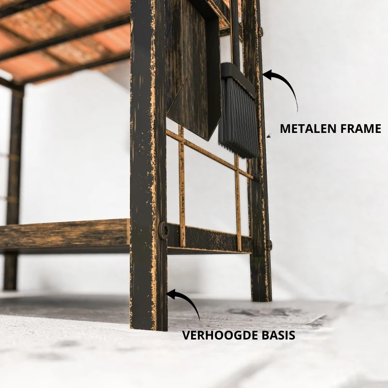 Wat deze haardhoutopslag echt uniek maakt? De meegeleverde 4-delige set haardgereedschap: een schep, pook, tang en bezem – allemaal op te hangen aan de geïntegreerde haken aan de zijkant. Zo heb je alles wat je nodig hebt voor een gezellige avond bij het vuur meteen bij de hand.
